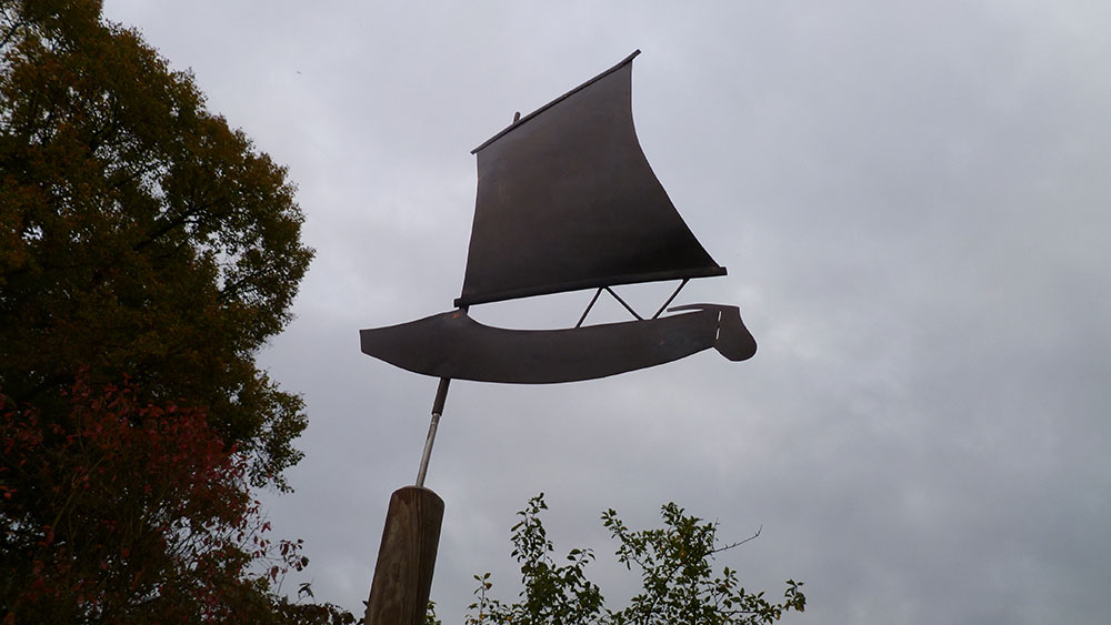 Der bronzene Vogel an der durch einen Windfang geschützten Eingangstür heißt alle Besucher willkommen.