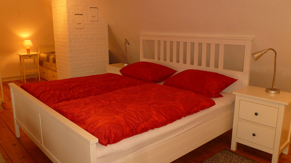 Über eine große Wendeltreppe ist der Schlafraum zu erreichen. Neben einem Doppelbett steht in einer Nische ein ausziehbares Tagesbett zur Verfügung. Ein riesiger Jugendstilschrank bietet ausreichend Platz für Ihre Garderobe. Vor dem Gaubenfenster lädt ein Nussbaumtisch zum Frühstück ein.